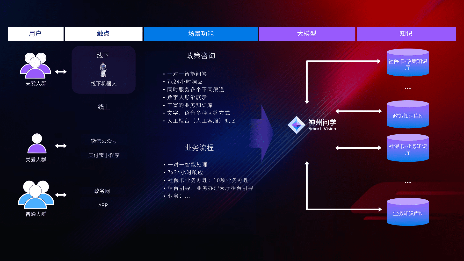 • 利用大语言模型+RAG技术,,,支持多轮对话,,可识别多种同义词、、、、近义词,,,精准理解关爱人群语义快速输出结果。。。